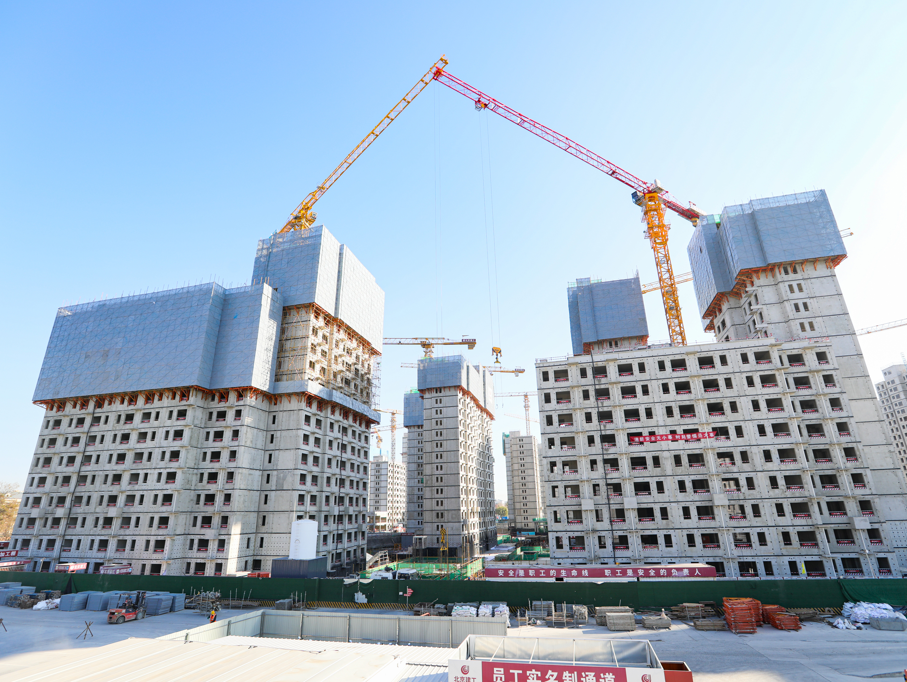 海子角辛店安置房建设工程四标段由10栋安置房和6栋配套公建共16栋建筑组成,总建筑面积约11.92万平方米,安置房地下3层、地上9-18层。四标段自今年7月中旬冲出“正负零”以来,历时4个月完成了18层装配式结构住宅楼施工,提前1个月完成了业主制定的目标计划。